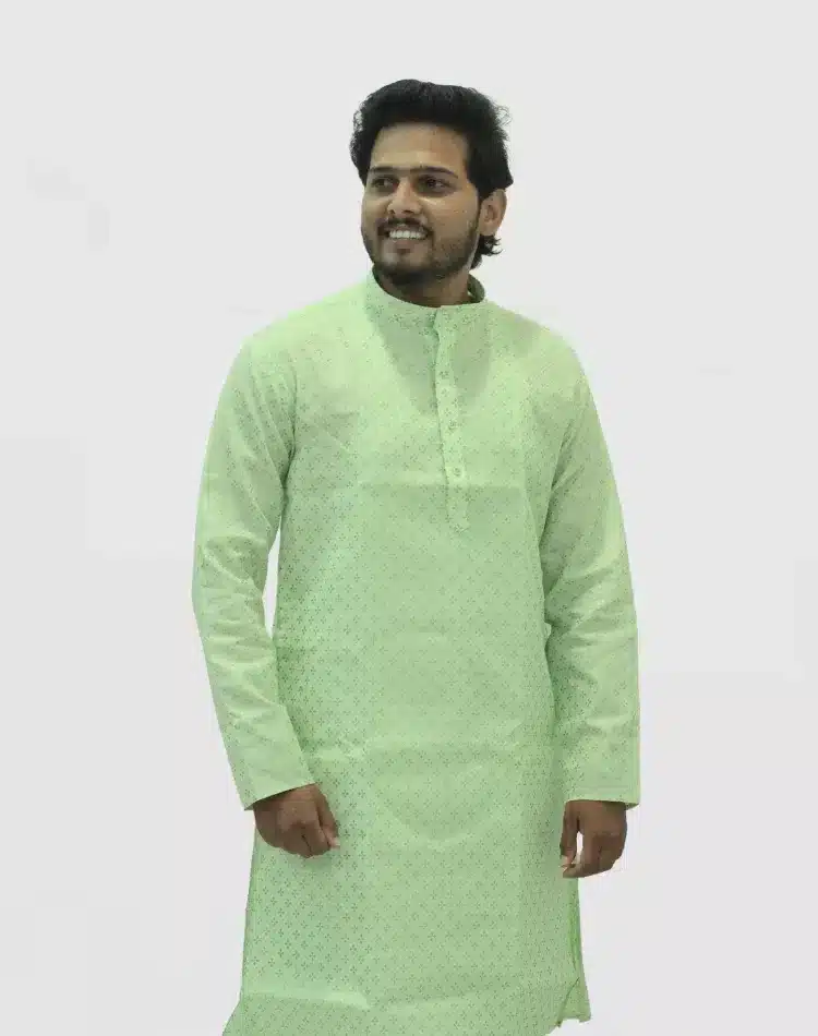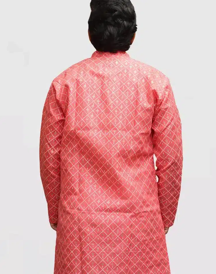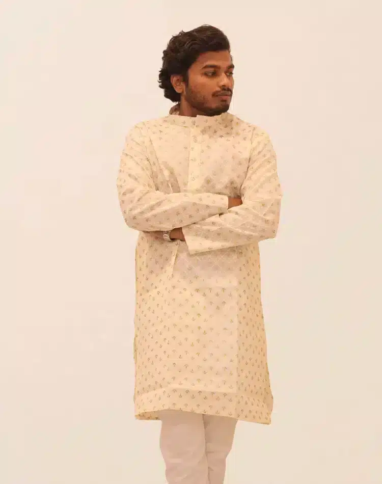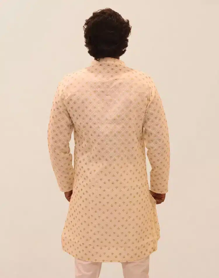 Celebrate Diwali in style with this exquisite patterned kurta. The kurta is adorned with a rich, all-over gold foil print that catches the light beautifully, featuring a delicate mix of geometric and subtle floral motifs. Crafted from a comfortable fabric with full sleeves and a classic band collar (mandarin collar), it offers a refined and festive appearance. This ivory kurta is a versatile choice for any special occasion, from puja ceremonies to family functions. Pair it with white or beige pajamas for a truly traditional look.