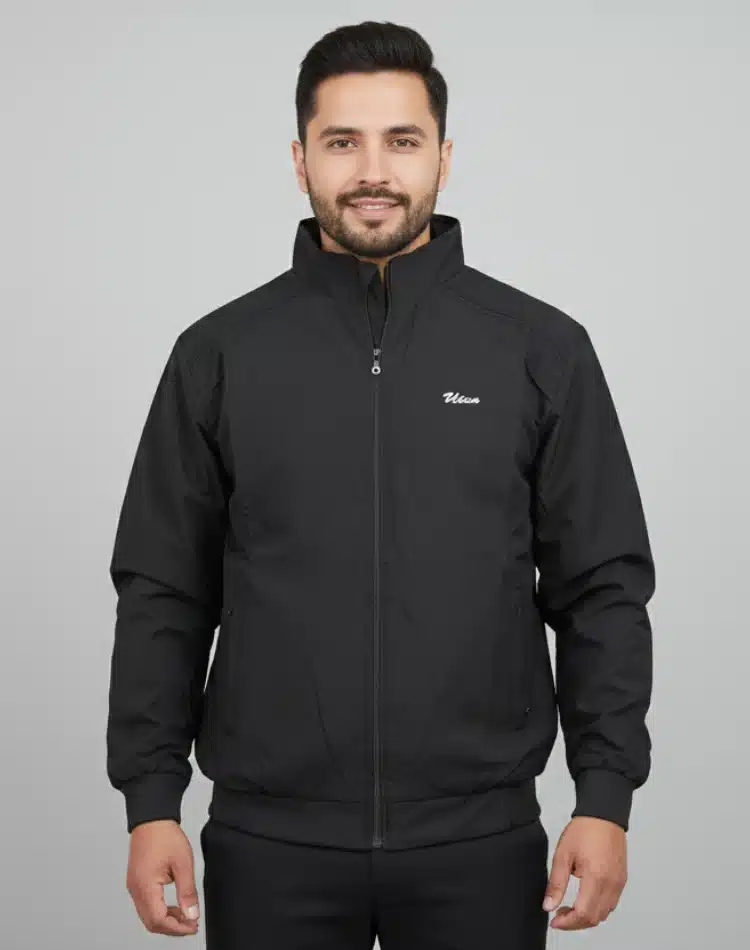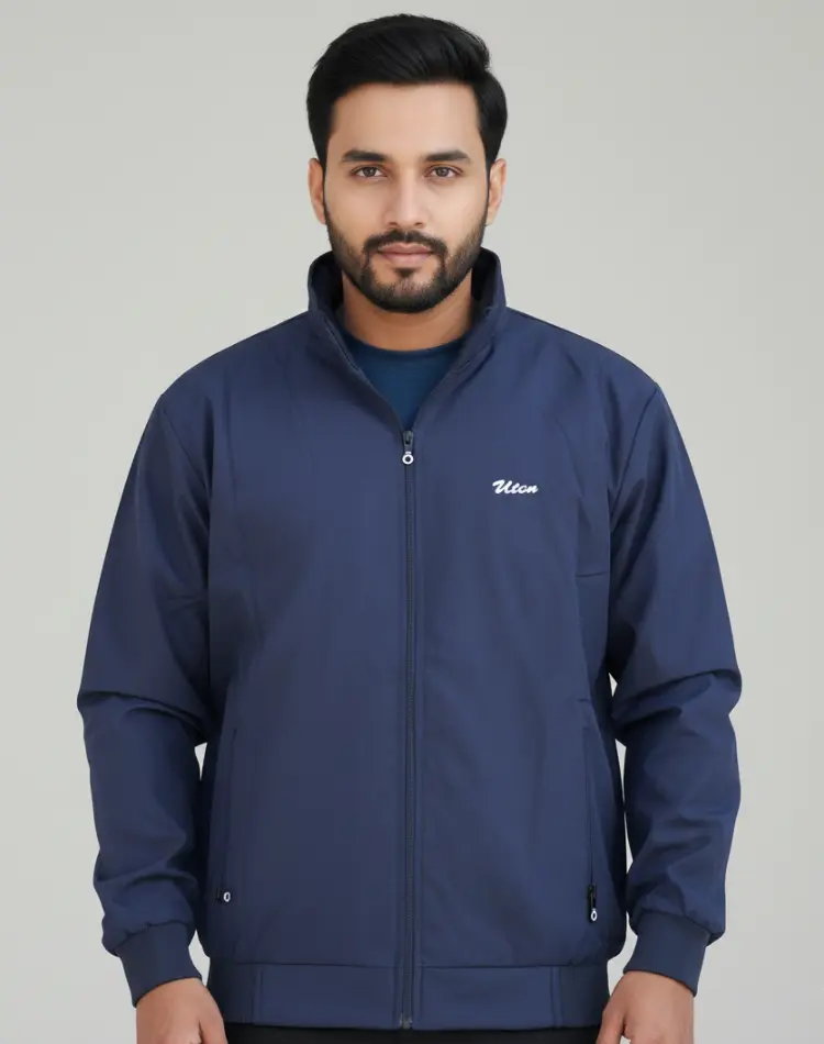 The Uton Navy Blue & Black Stand-Collar Sports Jacket is engineered for versatility and comfort. The robust navy blue material is excellent for everyday wear, offering protection and a clean, professional-casual appearance. The key feature is the high stand-up collar, which provides extra warmth and a sleek profile. It includes functional zip-up pockets for securing essentials and a comfortable elasticated waist and cuffs. A perfect layer for morning jogs, travel, or an effortlessly smart-casual outfit.